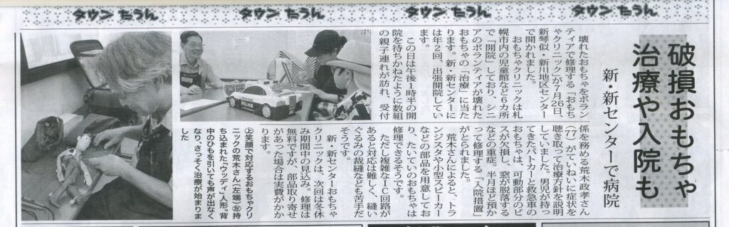連町機関紙「新琴似」におもちゃクリニックの活動が紹介されました 新琴似連合町内会と新琴似西連合町内会が、共同で発行している連町機関紙「新琴似」(2025年10月1日発行)に、7月26日「新琴似・新川地区センター」で行われたおもちゃの修理に様子が、掲載されました。活動の様子がとてもよくコンパクトにまとまっており、今後の活動の励みになります。連町機関紙「新琴似」編集者の皆さん、ありがとうございました。