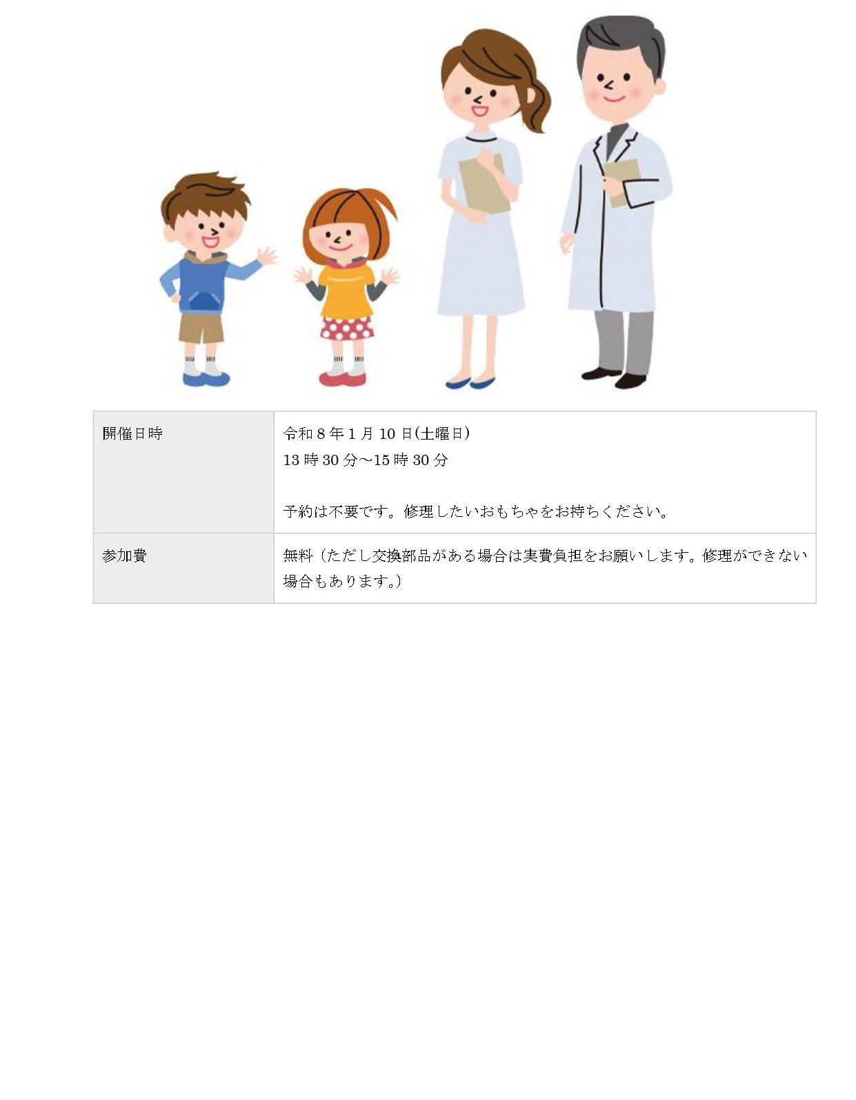 新琴似・新川地区センターで臨時おもちゃクリニックを開院しました。[令和8年(2026年)1月10日(土)] 令和8年(2026年)1月10日(土)に、新琴似・新川地区センターで臨時おもちゃクリニックを開院しました。たくさんの方が、壊れたおもちゃの修理のために訪れました。 修理風景